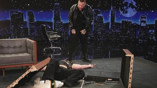 JELLY ROLL just brought some WWE-style chaos to late-night TV. During an appearance on Jimmy Kimmel Live!, he got into a hilarious staged scuffle with LOGAN PAUL and ended up chokeslamming the internet star right through a desk. Yep, you read that right. Jelly Roll, with the crowd going wild, picked him up and sent him flying through furniture like it was Monday Night Raw. Totally unexpected, completely outrageous, and 100% worth watching.